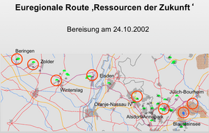 Eine der thematischen Klammern für die gesamte 3-Länder-Regikon D-NL-B sind die reichhaltigen Rohstoffvorkommen, durch diese war die Region führend im frühen Industrialisierungsprozess des 19. Jahrhunderts, hier entstanden die allerersten Industriestandorte, z.B. Eschweiler Bergverein als erste deutsche Bergbau AG. Dieses Konzept wird anhand einer konkreten Route durch die 3 Länder der Region von Hasselt bis nach Inden dargestellt. Diese "Route der Ressourcen" ist sowohl historischer Rückblick und Anker, stellt aber auch Ansatzpunkt künftiger Cluster-Bildungen neuer Industrien dar.