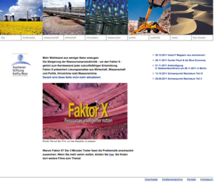 www.faktor-x.info wurde als Portal der Aachener Stiftung Kathy Beys zum Thema Ressourcen 2003 gemeinsam mit dem Journalisten Bert Beyers konzipiert und realisiert. Die Beiträge auf faktor-x.info spiegeln die Diskussion in ihrer gesamten Breite: technisch, wirtschaftlich und politisch - dabei durchaus kontrovers. Wesentlich - und neu - war die journalistische Aufmachung: die besten Köpfe, die interessantesten Ideen und Beispiele. Dabei sind die Wissenschaftler, Politiker und Wirtschaftslenker nicht nur im Interview lesbar, sondern sie kommen auch hörbar zu Wort. Das Portal wurde 2011 auf dem damaligen Stand eingefroren.